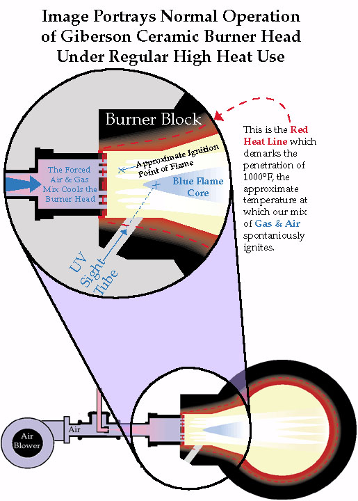 Troubleshooting Burner InstabilityIf you have found this section of the web site you are probably experiencing difficulties in getting the burner system to stabilize. Or perhaps you are experiencing burner pop-back. Others are prudently looking ahead to ward off any possible difficulty, "to head them off at the pass," so to speak. This is the page where we talk about a seemingly puzzling situation called "pop-back" or "pre-ignition" or sometimes called "burn back". We begin by showing what is a stable situation of ongoing combustion. Pictured here is an environment (glory hole or furnace) which is burning in a stable manner. The flame has a blue core, the environment is at working temperature, and the burner head and mixer are cool and could pass the touch test. Even the face of the head is relatively cool because of all the combustibles (cool air and gas) which are being pushed through it. The flame is burning quietly, but steadily. This is a happy burner system. ![]() In contrast, this next image shows a burner system with burner pop-back. This is a condition where the mixture of gas and air are burning in the mixer and head area of the burner system. If this condition goes on for a while, the head and pipe work may become cherry red. When the system is shut off and naturally left to cool for a few minutes, it most often can be re-lit and everything is fine. But sometimes there is damage to the pipe and head. An inspection of the head will reveal if there are any serious cracks, and if so the head should be repaired or replaced. If this furnace had a safety system it would have shut down immediately when the flame began to rumble (or flutter). Such a safety system could be hooked to an alarm to notify you of any burner or furnace abnormality. ![]() Here is a list of conditions that help identify this condition.